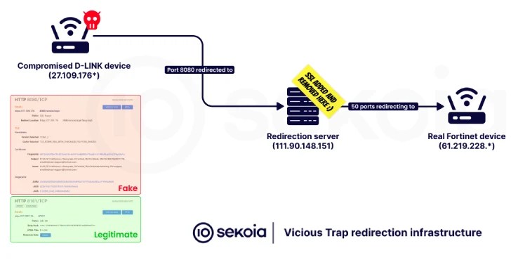 تشمل سلسلة العدوى تنفيذ سكربت شل، يُطلق عليه “نت غوست” (NetGhost)، والذي يعيد توجيه حركة المرور الواردة من منافذ محددة في جهاز التوجيه المخترق إلى بنية تحتية تشبه المصيدة الرقمية تحت سيطرة المهاجم، مما يسمح لهم باعتراض تدفقات الشبكة.